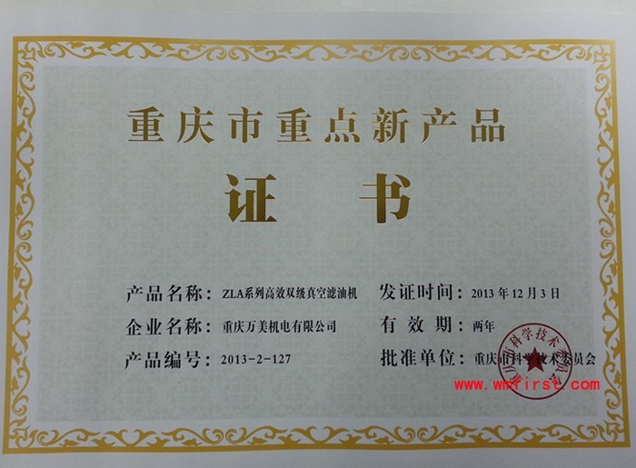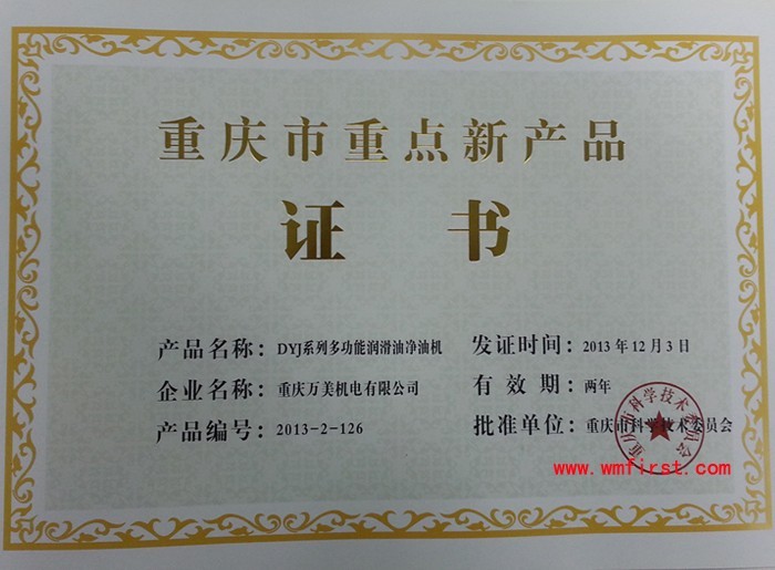 熱烈祝賀,我公司的“DYJ系列多功能潤滑油凈油機”、“ZLA系列高效雙級真空濾油機”經(jīng)重慶市科學(xué)技術(shù)委員會相關(guān)專家的鑒定,榮獲重慶市科學(xué)技術(shù)委員會頒發(fā)的重慶市重點新產(chǎn)品證書。而在此之前,我公司的這兩個系列的凈油機(濾油機)就已是專利及高新技術(shù)產(chǎn)品。此外,我公司還有多款濾油機擁有專利和高新技術(shù)產(chǎn)品稱號。