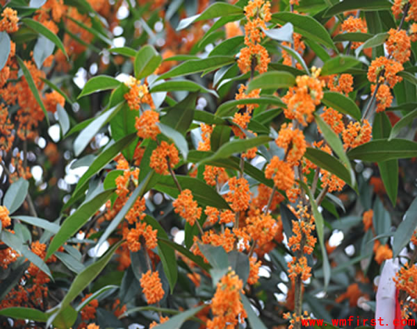 走進(jìn)桂花園地,首先印入眼簾的是一大片綠色,一顆顆桂花樹整齊有序的排列在一起,蔥蘢的樹葉中,開滿了小花,有金桂、銀桂、丹桂、朱砂桂、狀元紅等品種,一朵朵四瓣小花簇?fù)碓诟髯缘闹︻^,當(dāng)?shù)氐娜藘好χ烧占h香四溢的花朵,金桂的每顆樹下"金沙鋪地",美不勝收。